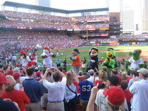 It’s been an incredibly busy and super fun week for me. I was able to fly west to St. Louis to hang out with all my mascot buddies from around the league and to support Ryan Zimmerman, our very own all star! The week started off great as I joined Fredbird, Rangers Captain, Pirate Parrot and Stomper at the opening ceremonies of FanFest. Hall of Famer Ozzie Smith cut the ribbon to the entrance of the convention center, and the all star festivities were officially underway!
