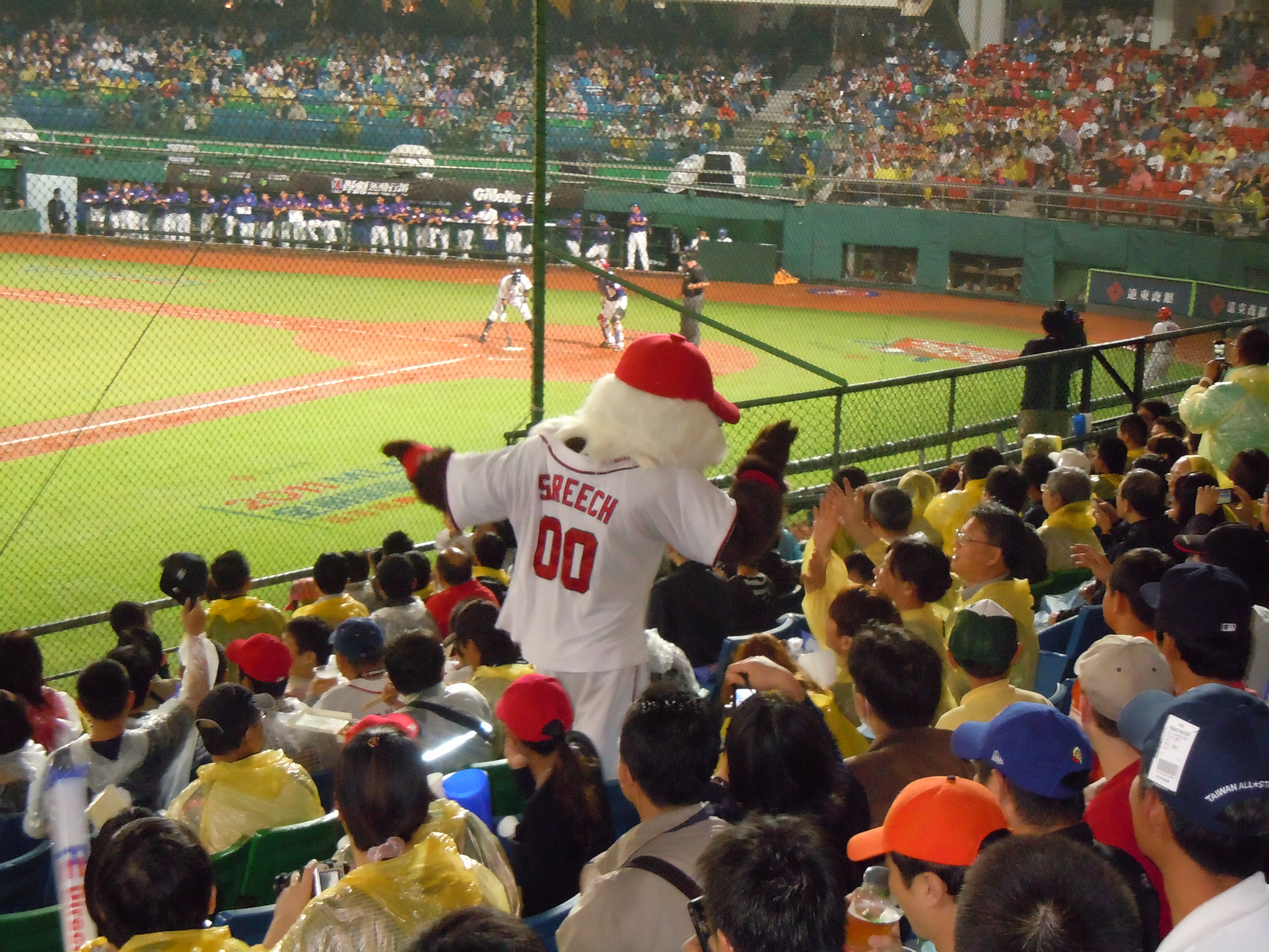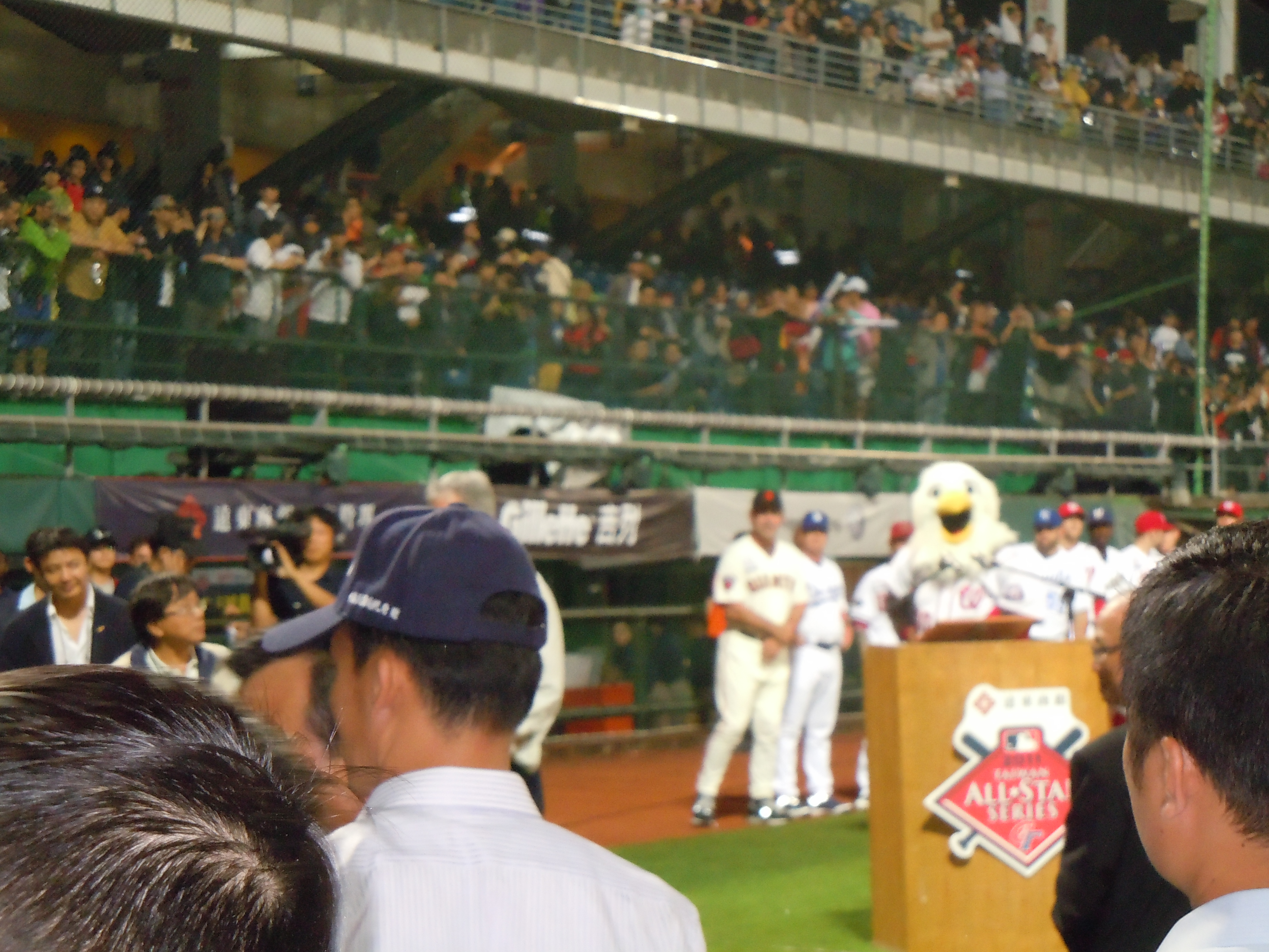 The stadium was nearly at capacity a full hour and a half before the scheduled first pitch. The atmosphere was electric and the people were genuinely excited to see the MLB all stars play in their home country. Unfortunately there was a bit of a rain delay to start the game so we weren’t able to do starting lineup introductions or have me deliver the first pitch to the mayor of Taipei. Instead, after anthems and a few speeches by VIPs including Taiwan’s president, we went directly into the game being played.