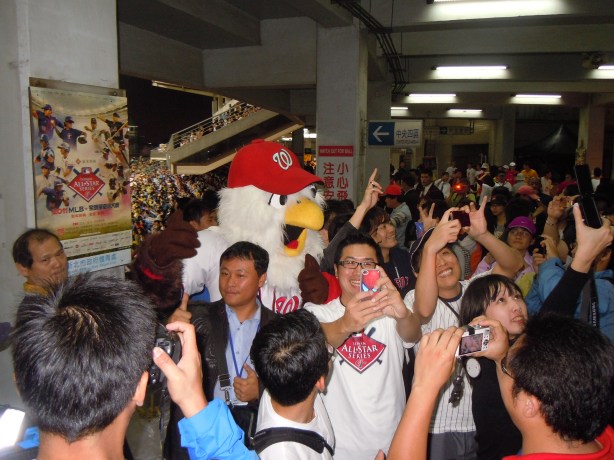 worked the stands and concourse and even did a magic trick turning a fan wearing a jacket into a fan wearing a Wang jersey. The MLB all stars ended up winning the rain-shortened game by the score of 7-0 with highlights coming from a Curtis Granderson grand slam and a Michael Morse double. It’s very clear that Michael Morse is one of the most recognized and loved player from the MLB squad. Whenever he is introduced, there is a loud ovation.