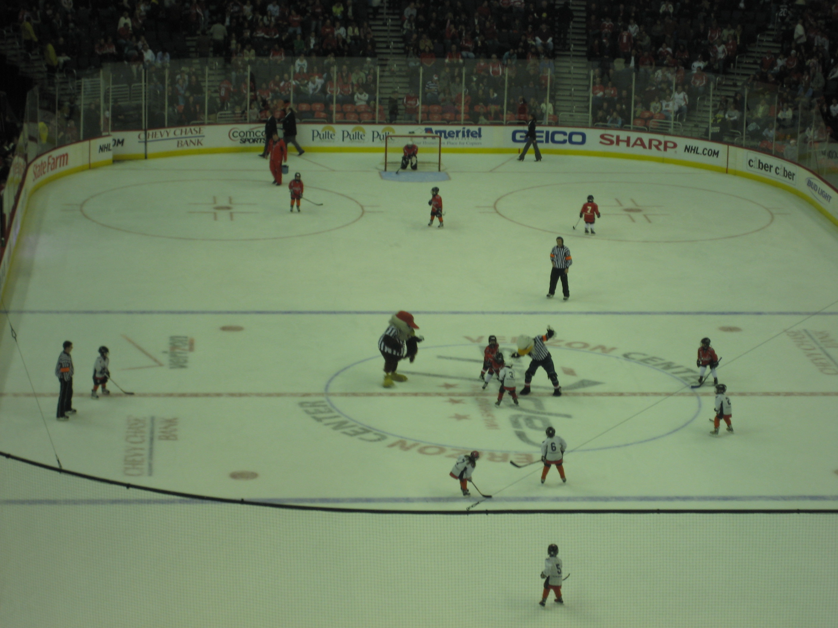 It’s been a busy week for me, and boy does that make me happy. I’ve been running around town so much meeting so many Nationals fans, it’s no wonder I’m skinny now! On Tuesday I spent my day at the Metro Center and Farragut North metro stops with my fellow Nat Packers to meet with fans and pass out pocket schedules for the upcoming season. The day was cold, but the thought of baseball made me all warm inside! I was so happy to receive all sorts of comments on my new, slimmer look! On Wednesday I visited Modells Sporting Goods store in Bethesda. That store is like a candy store…..I wanted everything! I spent a lot of my time checking out some new baseball mitts and bats for the upcoming season and met some Nats fans that stopped by. Thursday night was a lot of fun because I was able to hang out with my cousin Slapshot at the Verizon Center for the Capitals game against the Maple Leafs. I helped Slapshot ref a “mites on ice” game that took place during intermission. Even though the Capitals lost, their fans were great and really appreciated me coming. After the reffing, I watched some of the game and had a great time “rocking my red!” Today I spent my day infront of PNC bank in North East DC and had a great time waiving to all the cars that passed!
